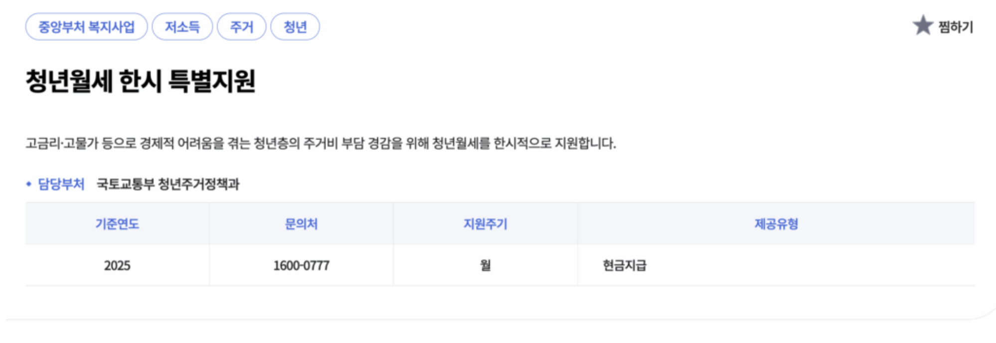 | 지원목적 | 청년 주거비 경감 및 주거 안정. 2025년 청년월세한시지원 핵심. |