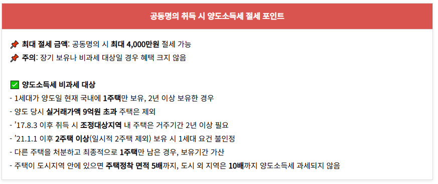 📌 공동명의 장점 핵심: 양도세 절감은 단기·중장기적으로 가장 큰 절세 효과를 발휘합니다.