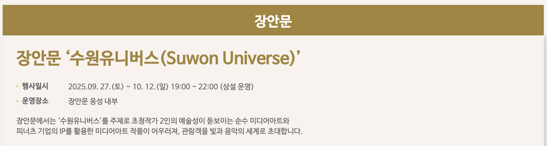 - 동선: 장안문 집결 → 성곽 라이트 워크 → 화서문 포토존 → 장안공원 미디어파크 체험.