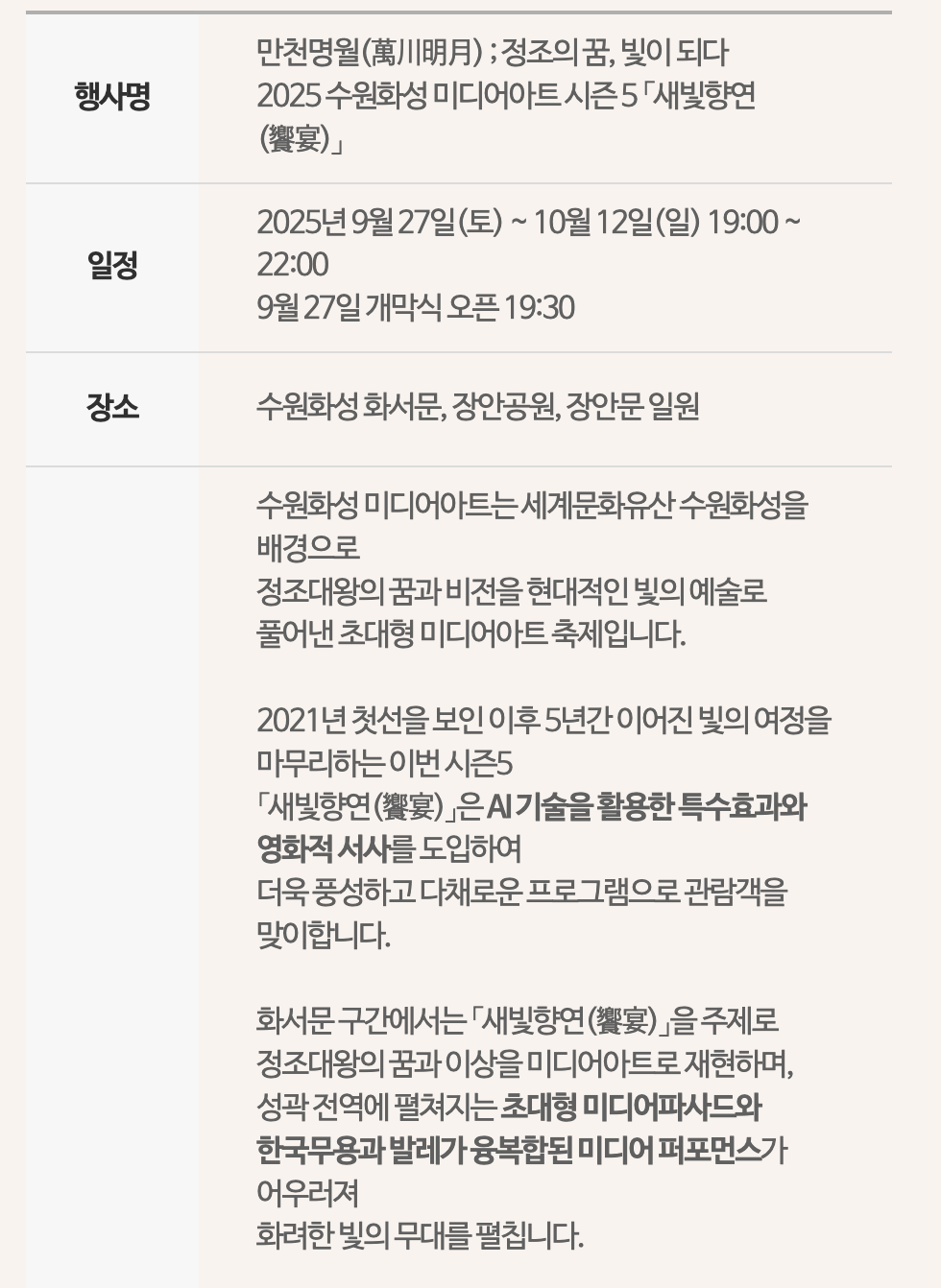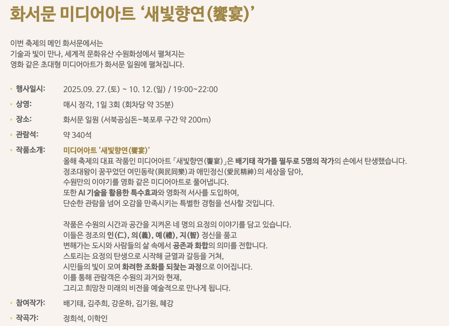 • 동선: 장안문 집결 → 성곽 라이트 워크 → 화서문 포토존 → 장안공원 미디어파크 체험.