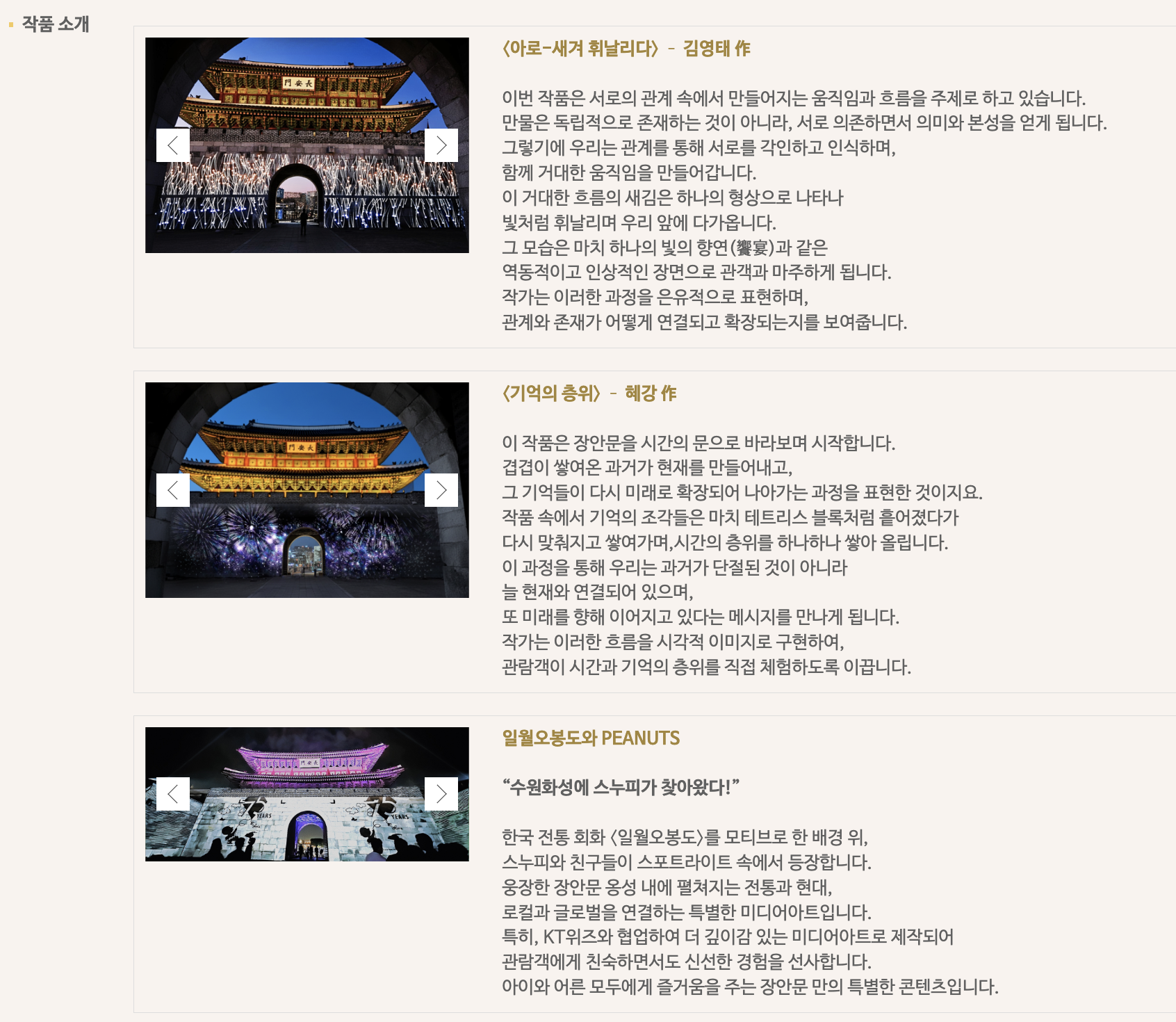 - 18:30 장안문 집결 → 19:00 수원화성 미디어아트 1회차