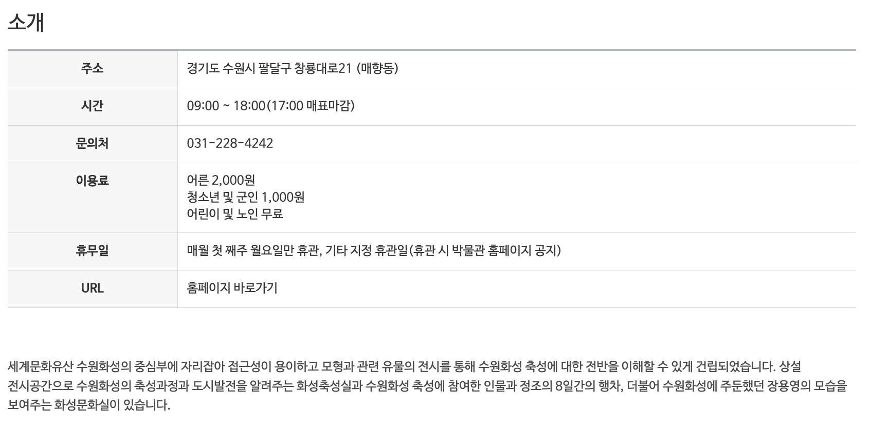 수원박물관 | 09~18시 | 정조 행차 특설 | 키즈 워크북 제공 |