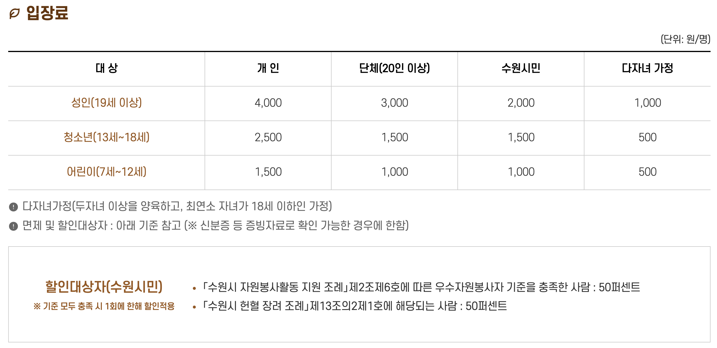 연휴 기간 대부분 정상 운영, 추석 당일 무료. 조용한 전시 감상이 가능한 수원 추석 행사 가볼만한 곳이며, 주차 공간이 비교적 안정적입니다. ‘을묘원행 230주년’, ‘어린왕자전’ 등 기획전이 시즌 베스트.