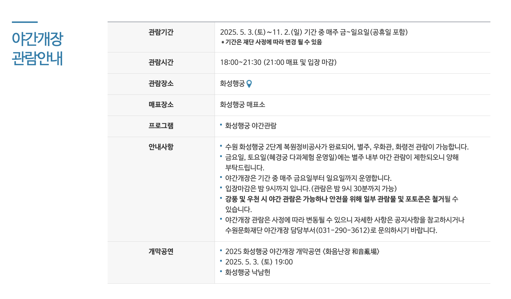 현장 팁 · 삼각대 제한 구간이 있어 스마트폰 손잡이·목걸이 스트랩이 유용합니다. 주차는 장안문 공영주차장이 만차가 빨라 광교·종합운동장 환승주차 후 버스가 시간 절약. 우천 시에도 일부 상영 진행되나 강풍·호우 경보 시 취소될 수 있습니다.