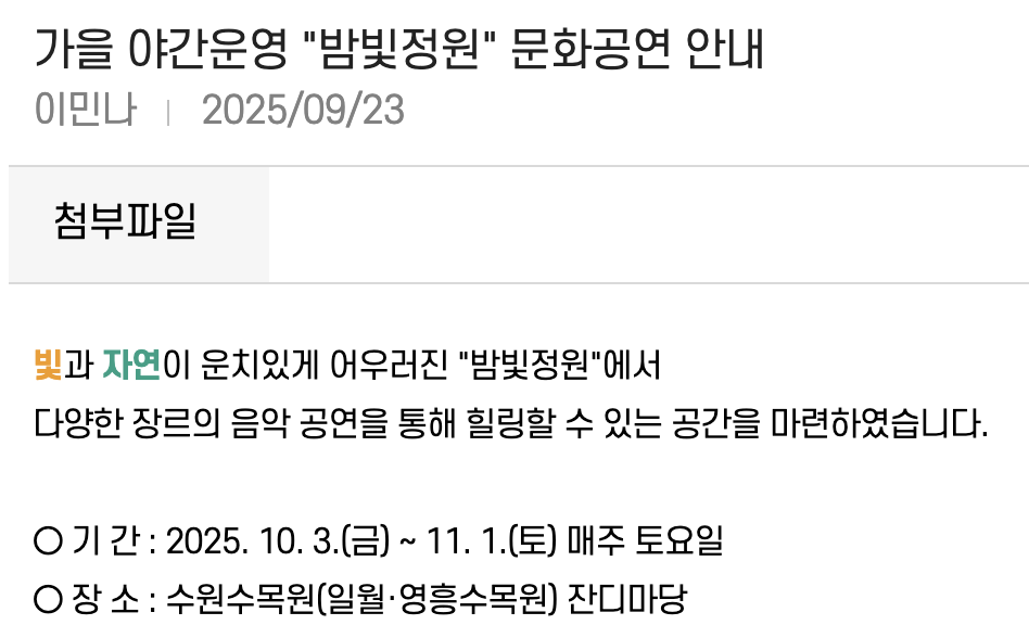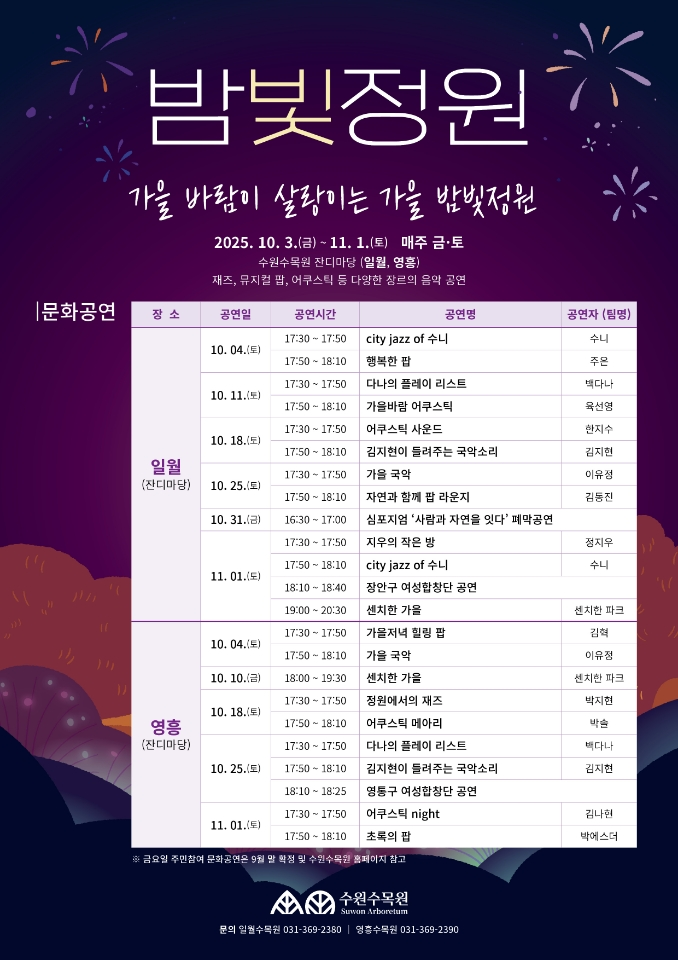 - 16:00 수원수목원 밤빛정원 산책 → 19:30 시네마 파크 콘서트(해당일)